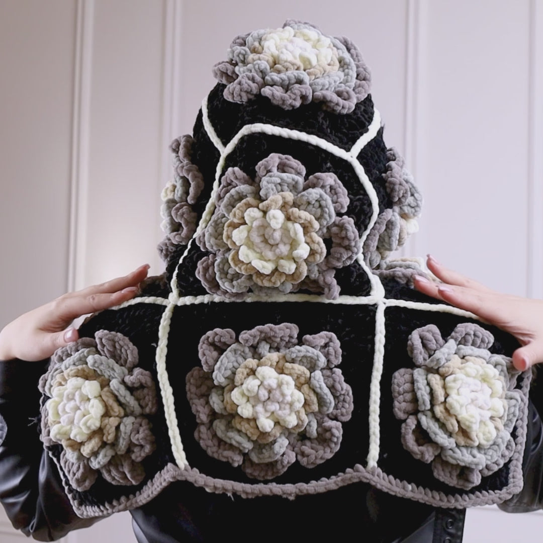 This crochet plush balaclava combines soft three-dimensional flowers with a defined shape made of granny square motifs that gently wrap around your head and shoulders. This cozy accessory will keep you warm and protected from the cold and wind this winter.